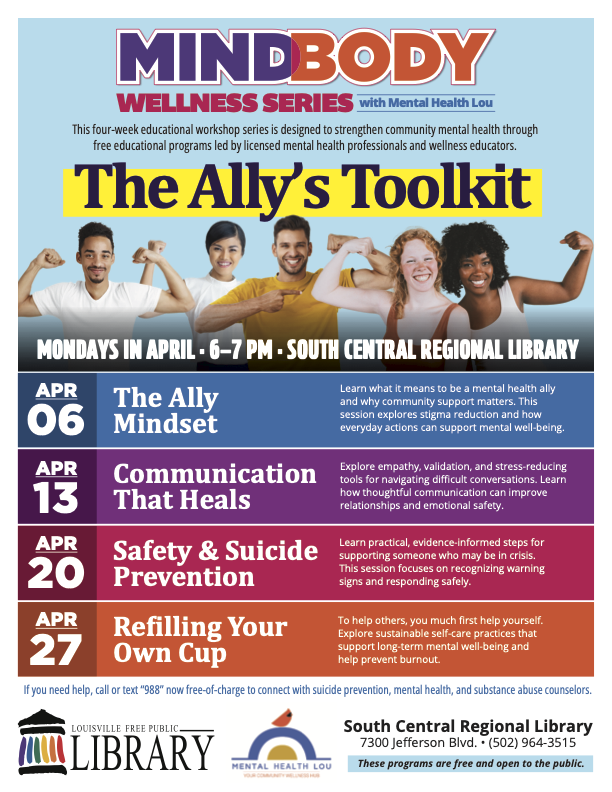 The Ally’s Toolkit is a four-week educational workshop series designed to strengthen community mental health through accessible, stigma-reducing programming. The series teaches foundational mental health skills, allyship, suicide prevention, and sustainable self-care practices. Sessions are led by licensed mental health professionals and wellness educators.