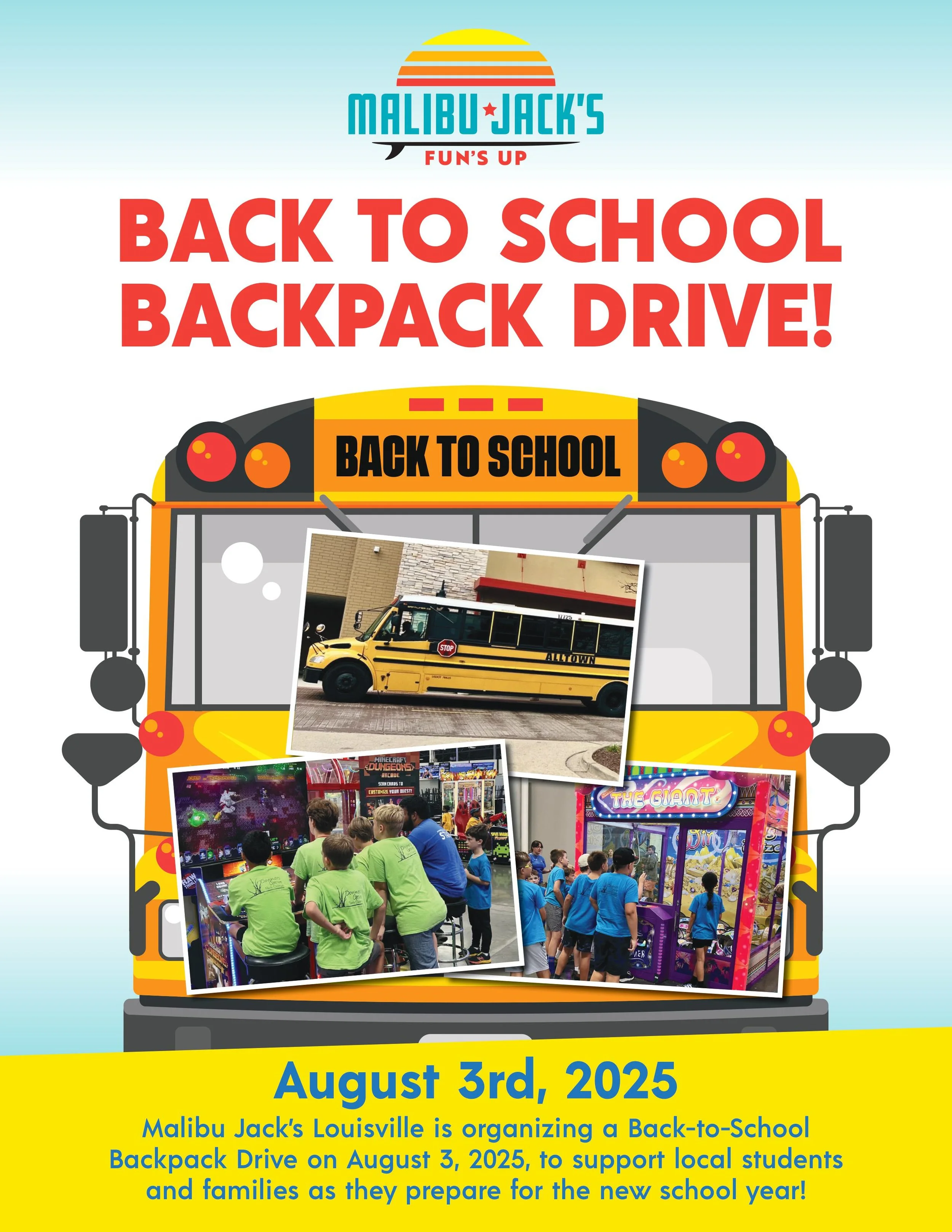 Malibu Jack’s Louisville is organizing a Back-to-School Backpack Drive on August 3, 2025, to support local students and families as they prepare for the new school year!