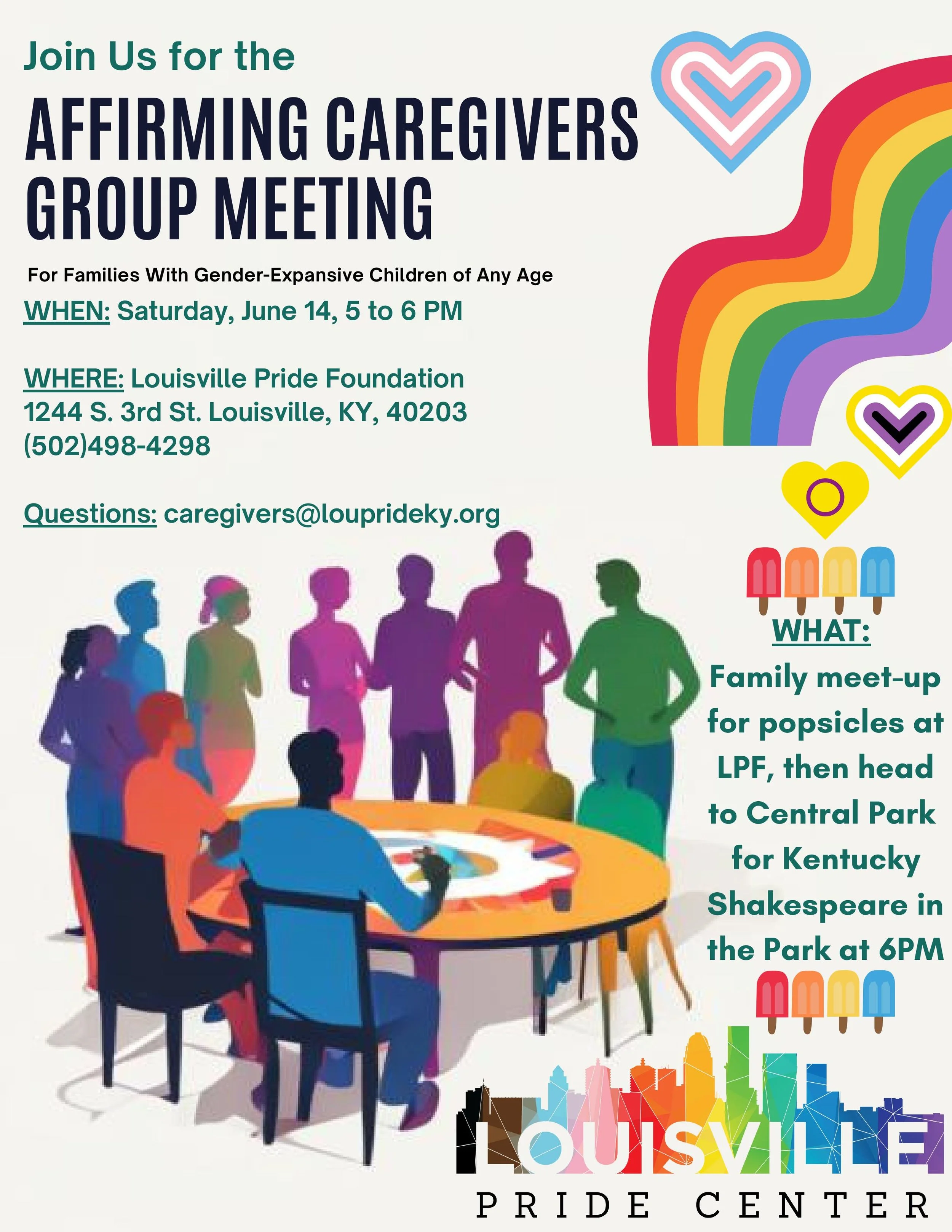 Louisville Pride Presents: AFFIRMING CAREGIVERSGROUP MEETING Saturday, June 14, 2025 5:00 PM 6:00 PM Louisville Pride Foundation 1244 South 3rd Street Louisville, KY, 40203 United States (map) Google Calendar ICS